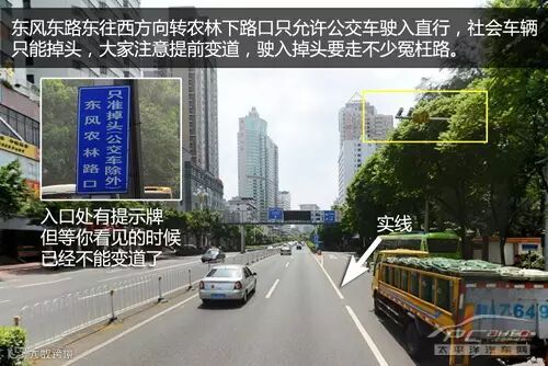 易错原因:东风东路转农林下路的辅导不允许除公交车以外的社会车辆直行,所有社会车辆一律只许桥下掉头。但提示牌订的位置在桥柱子上,等司机们看清指示牌后基本上已经进入了实线封闭区,无法变道,只能到桥下掉头再走一遍。
