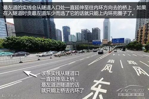 黄埔大道作为广州市中心最繁华的主干道之一,车流量从早到晚都很大。而黄埔大道隧道在入口到出口之前有一条很长的实线分道,最左边道的实线封闭从入隧道前就开始一直持续到出隧道上桥去往内环路。在车流较大时,去往内环路车辆不多的时段,最左道会比其它几条车道看起来顺畅不少,不熟悉情况的师傅很容易贪一时之快驶入最左道,结果只能上了内环。
