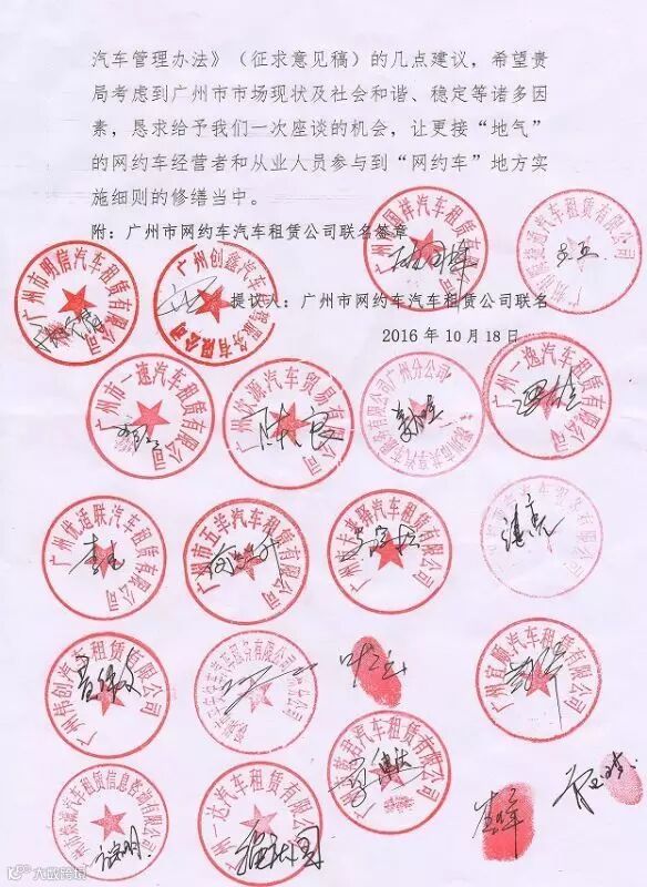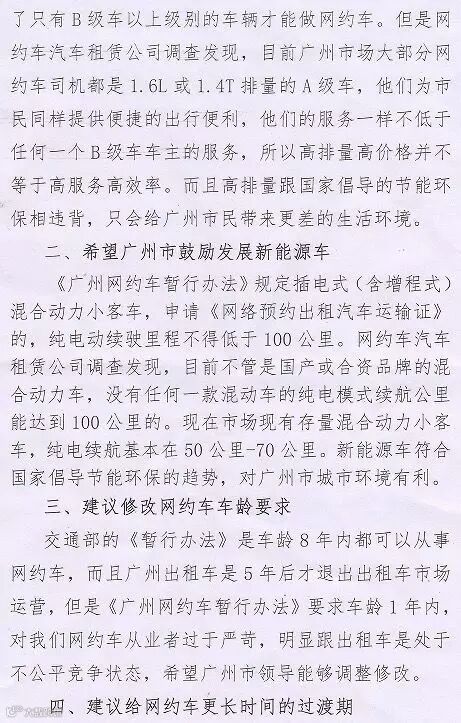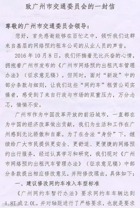 10月18日,本市20多家同行发出建议信,希望制定地方细则的政府领导能够采纳,为广州市民、广大网约车司机提供一个更加包容和谐的发展空间。
