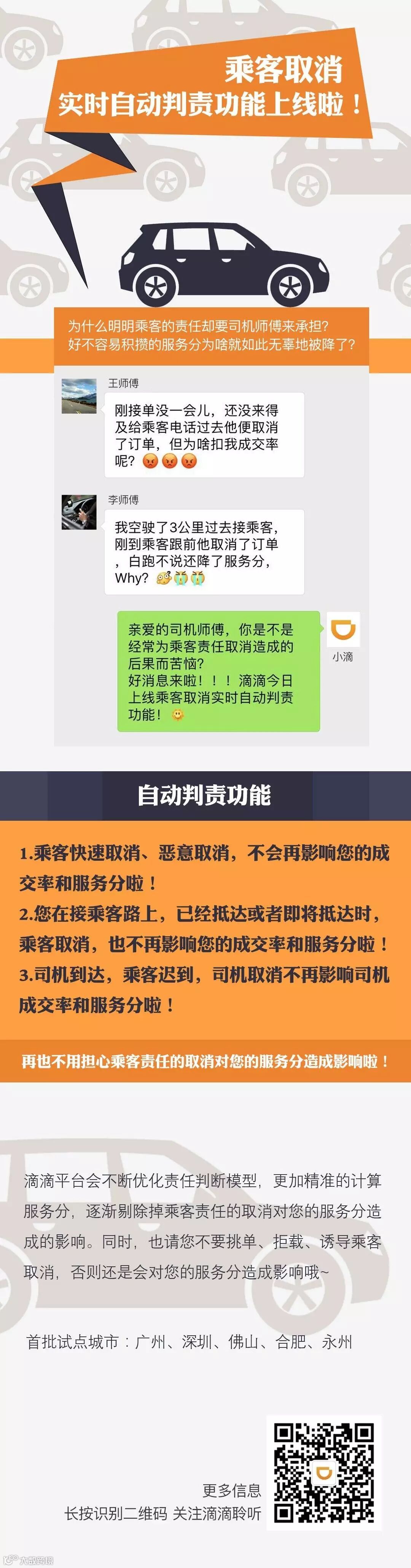 该新功能又强大又人性化:司乘取消时,若取消模型判定乘客无责,则不收取消费;若模型判定司机无责,则不影响成交率和服务分。你关心的司机部分:
