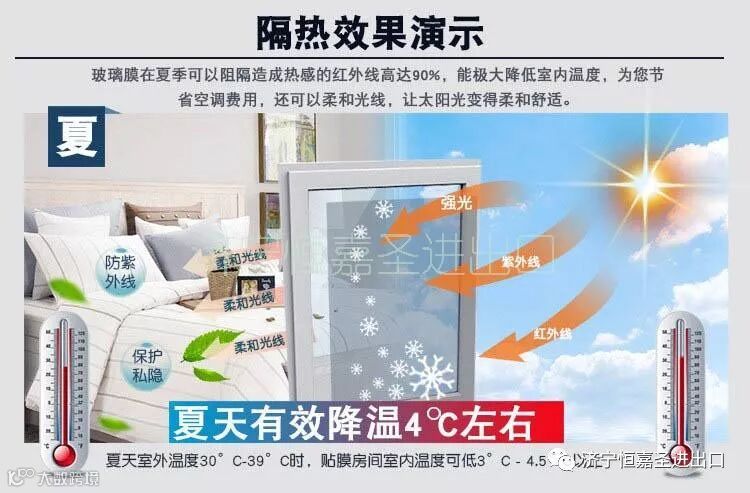 防晒隔热太阳膜,隔热防晒防爆,部分型号具有单向透视功能,贴上不刺眼,效果非常好,使用寿命10年以上,与传统窗帘相比,普通窗帘遮光不隔热,安装麻烦,成本较高,清扫不便,现在粘贴太阳膜已成为家装工装新宠,并逐渐取代传统安装模式。