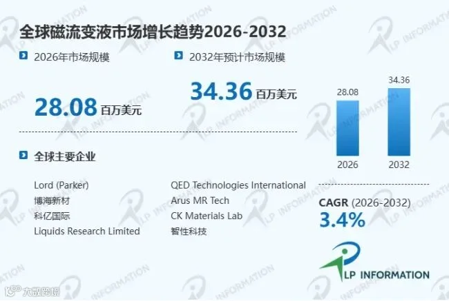 据路亿市场策略(LP Information)调研团队最新报告“全球磁流变液市场增长趋势2026-2032”显示,2025年全球磁流变液市场规模大约为26.66百万美元,预计2032年达到34.36百万美元,2026-2032期间年复合增长率(CAGR)为3.4%。