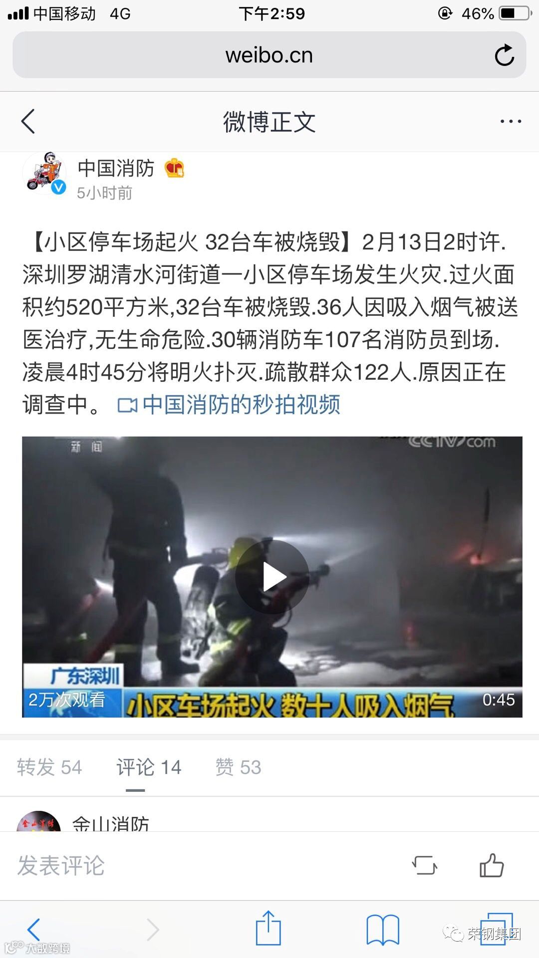 荣钢集团据中国消防官微报道:2月13日2时许,深圳罗湖清水河街道一小区停车场发生火灾,过火面积约520平方米,32台车被烧毁,36人因吸入烟气被送医治疗,无生命危险,30辆消防车107名消防员到场。凌晨4时45分将明火扑灭,疏散群众122人。原因正在调查中。