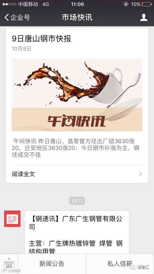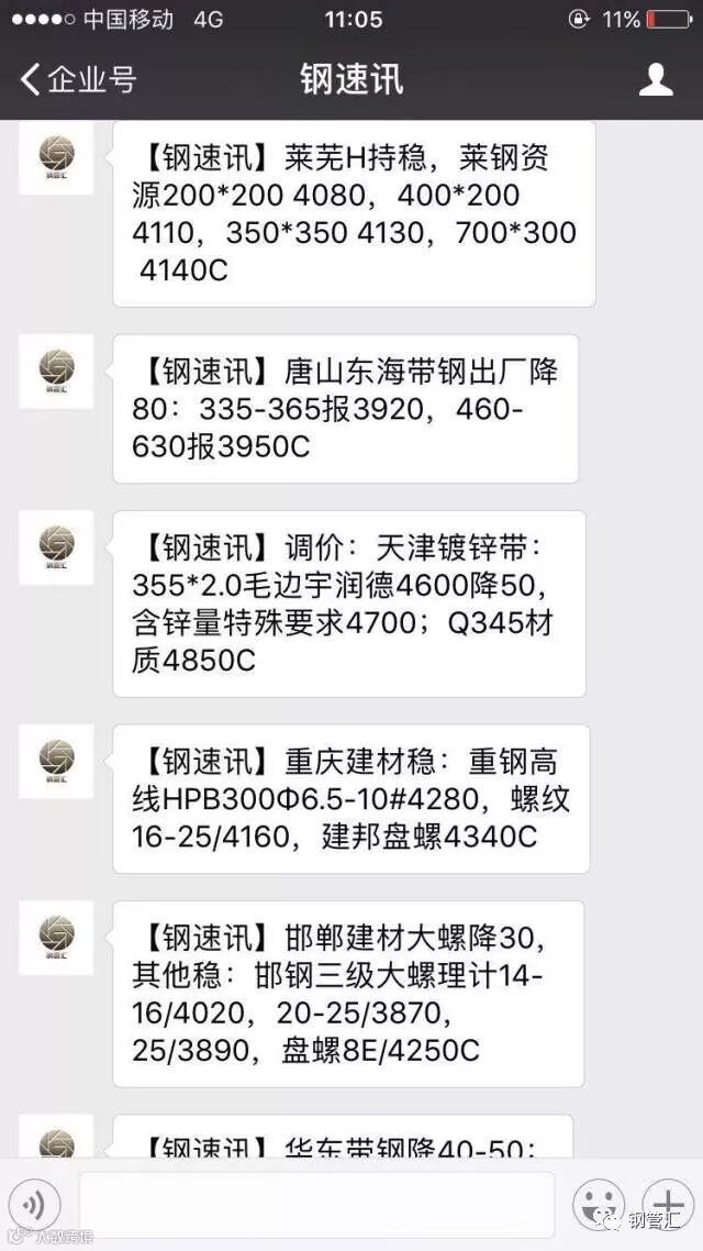我们广东荣钢和河北唐宋联手打造的一个钢速讯信息平台,这个平台主要是以微信企业号平台发布,去让客户了解最新,最全面的全国各地的钢材走势,预测和各种镀锌管,焊管,带钢,钢坯,等各种出厂价格信息,若您有这方面需求,我们钢速讯都给您推送,微信18718738305(邹小姐)或下图二维码添加微信领取试用名额。可免费试用七天,如果觉得还不错的话可以联系电话18718738305(邹小姐),只需280元/年的就可以继续这项服务的,品种无限制或者手机短信接收任一品种钢材信息,每天14条,400元/年。