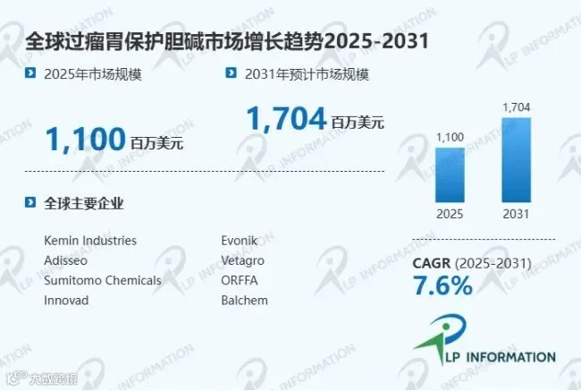 据路亿市场策略(LP Information)调研团队最新报告“全球过瘤胃保护胆碱市场增长趋势2026-2032”显示,预计2031年全球过瘤胃保护胆碱市场规模将达到1704百万美元,未来几年年复合增长率CAGR为7.6%。
