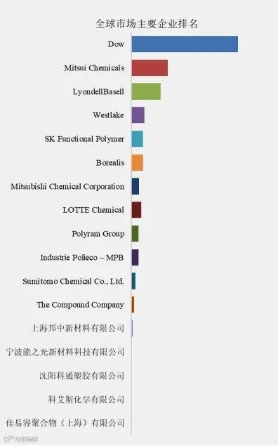 全球市场主要聚烯烃粘合树脂生产商包括Dow、 Mitsui Chemicals、 LyondellBasell、 Westlake、 SK Functional Polymer、 Borealis、 Mitsubishi Chemical Corporation、 LOTTE Chemical、 Polyram Group、 Industrie Polieco – MPB、 Sumitomo Chemical Co., Ltd.、 The Compound Company、 上海邦中新材料有限公司、 宁波能之光新材料科技有限公司、 沈阳科通塑胶有限公司、 科艾斯化学有限公司、 佳易容聚合物(上海)有限公司等。