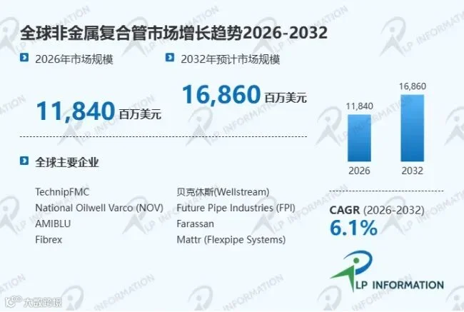 据路亿市场策略(LP Information)调研团队最新报告“全球非金属复合管市场增长趋势2026-2032”显示,2025年全球非金属复合管市场规模大约为11190百万美元,预计2032年达到16860百万美元,2026-2032期间年复合增长率(CAGR)为6.1%。