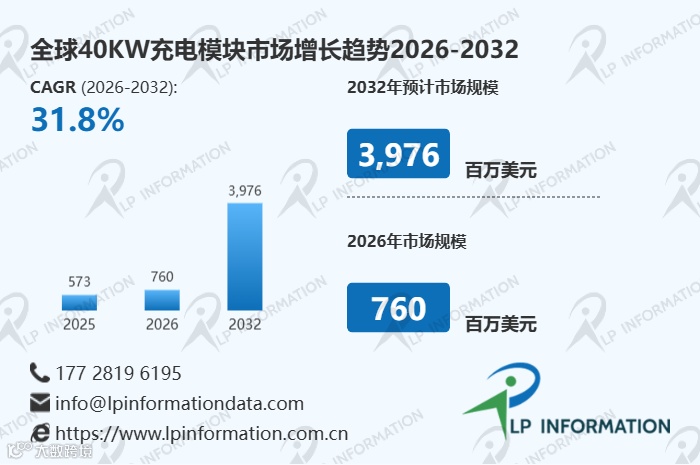 2025年全球40KW充电模块市场规模大约为573百万美元,预计2032年达到3976百万美元,2026-2032期间年复合增长率(CAGR)为31.8%。