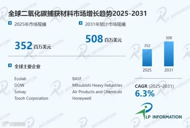据LP Information(路亿市场策略)调研团队最新报告“全球二氧化碳捕获材料市场增长趋势2026-2032-LP Information”显示,2024年全球二氧化碳捕获材料市场规模大约为316百万美元,预计2031年达到508百万美元,2025-2031期间年复合增长率(CAGR)为6.3%。