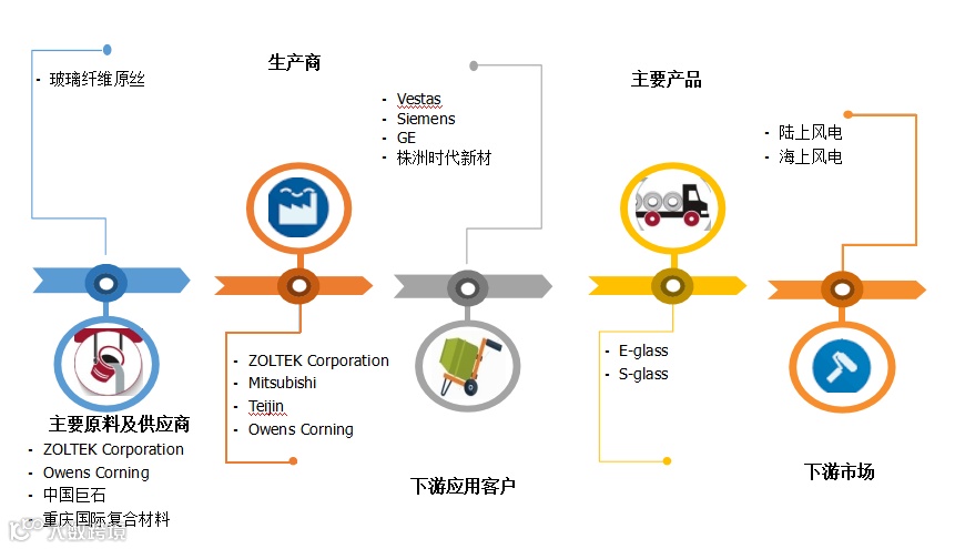 生产公司:Saint-Gobain、PPG Industries、Nittobo、3B Fibreglass、ZOLTEK Corporation、Mitsubishi、Hexcel、Teijin、SGL Carbon、Formosa Plastics Corp、Dow、Hyosung、Taekwang Industrial、Owens Corning、浙江振石新材料、常州宏发织模新材料、泰山玻纤、重庆风渡新材料、中材科技、上纬新材、中国巨石、四川威玻新材料、江苏正威新材料、江苏长海复合材料、河南光远新材料、重庆国际复合材料、江苏恒神等。