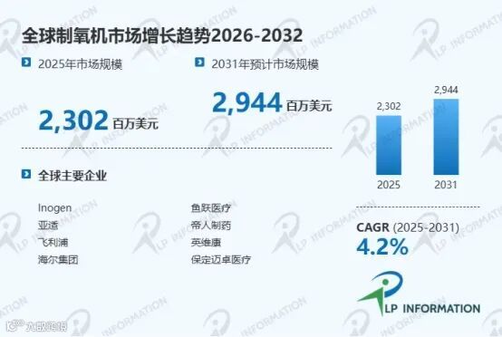 2025年全球制氧机市场规模大约为2302百万美元,预计2031年达到 2944百万美元,2026-2032期间年复合增长率(CAGR)为 4.2%。