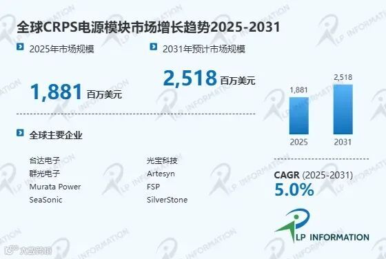 据路亿市场策略(LP information)调研团队最新报告 《全球CRPS电源模块市场增长趋势2026-2032》 显示,2024年全球CRPS电源模块市场规模大约为1795百万美元,预计2031年达到2518百万美元,2025-2031期间年复合增长率(CAGR)为5.0%。