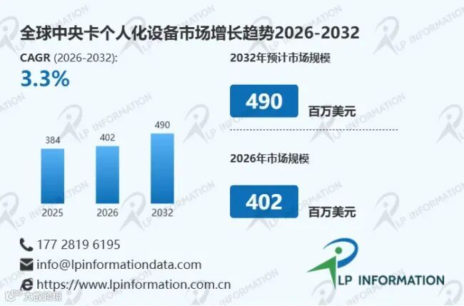 据LP Information调研团队最新报告“ 全球中央卡个人化设备市场增长趋势2026-2032-LP Information ”显示,2025年全球中央卡个人化设备市场规模大约为384百万美元,预计2032年达到490百万美元,2026-2032期间年复合增长率(CAGR)为3.3%。