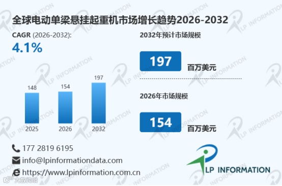 2025年全球电动单梁悬挂起重机市场规模大约为148百万美元,预计2032年达到197百万美元,2026-2032期间年复合增长率(CAGR)为4.1%。