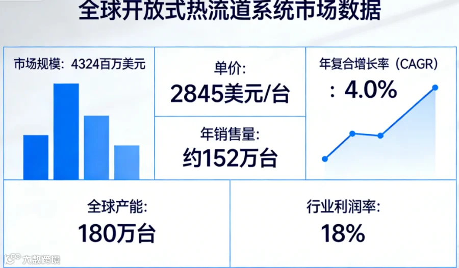 全球开放式热流道系统市场规模4324百万美元,cagr 4.0%,单价2845美元/台,年销售量约152万台,全球产能180万台,行业利润率18%。