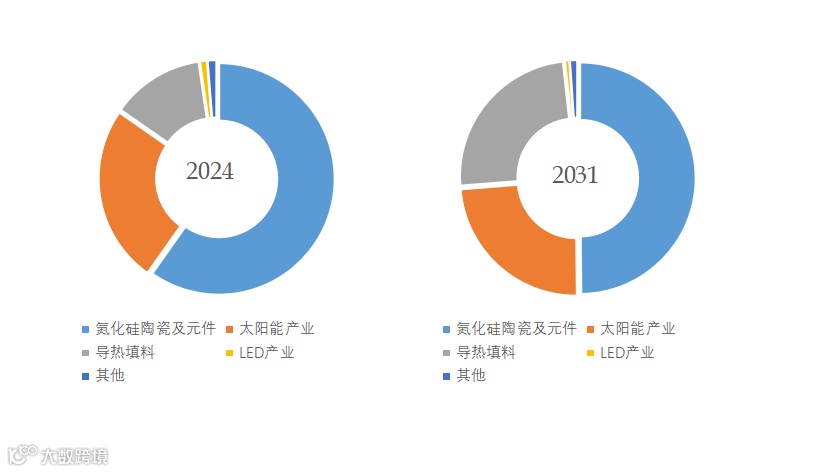 氮化硅粉末广泛应用于氮化硅陶瓷及元件、太阳能产业、导热填料、LED产业、其他等。其中,氮化硅陶瓷及元件是最主要的需求来源。2024年氮化硅陶瓷及元件占据大约59.8%的收入份额。