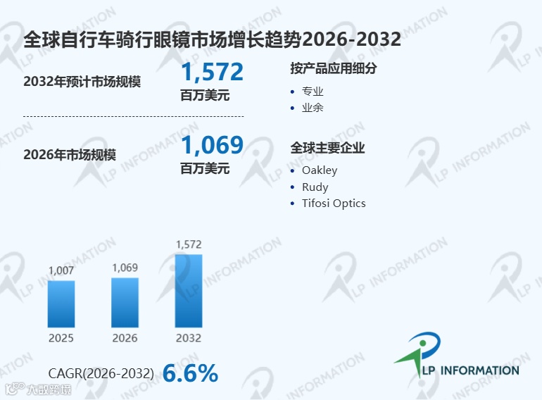 根据LP Information(路亿市场策略)最新调研报告《全球自行车骑行眼镜市场增长趋势2026-2032-LP Information》显示,2025年全球自行车骑行眼镜市场规模大约为1007百万美元,预计2032年达到1572百万美元,2026-2032期间年复合增长率(CAGR)为6.6%。