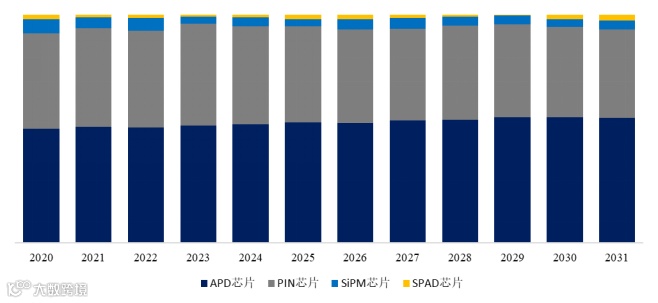 就产品类型而言,目前APD芯片是最主要的细分产品,占据大约52%的份额。