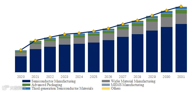 就产品应用而言,目前Semiconductor Manufacturing是最主要的需求来源,占据大约73.1%的份额。