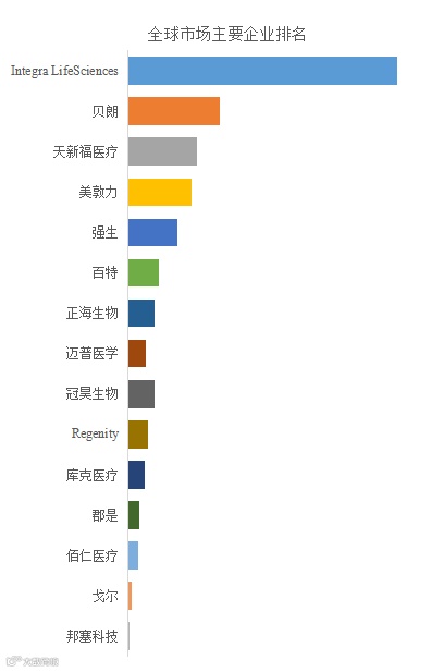 全球范围内,硬脑膜补片主要生产商包括Integra LifeSciences、贝朗、天新福医疗、美敦力、强生等,其中前五大厂商占有大约64%的市场份额。