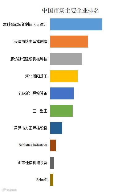 中国范围内,钢筋网焊接机主要生产商包括建科智能装备制造(天津)、天津市银丰智能制造、廊坊凯博建设机械科技、河北骄阳焊工、宁波新州焊接设备等,其中前五大厂商占有大约64.45%的市场份额。