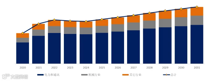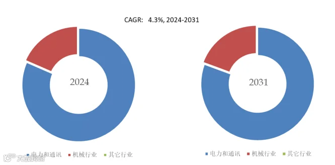 就产品应用而言,目前电力和通讯是最大的下游市场,2025年占有69.6%份额。