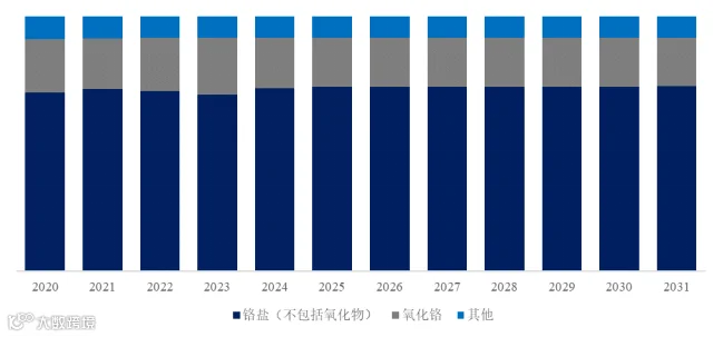 就产品类型而言,目前铬盐(不包括氧化物)是最主要的细分产品,占据大约71.8%的份额。
