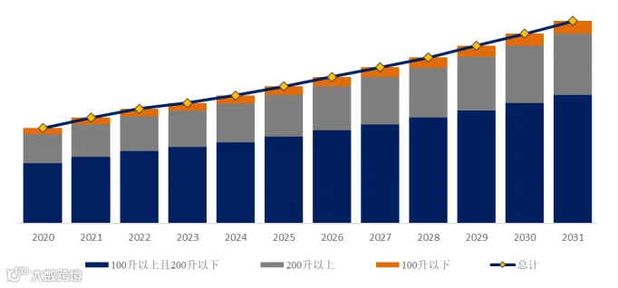 就产品类型而言,目前100升以上且200升以下是最主要的细分产品,2025年占据大约63.2%的份额。