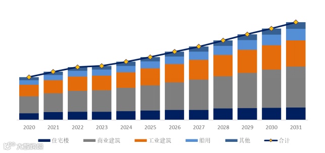 就产品类型而言,目前商业建筑是最主要的需求来源,占据大约40%的份额。