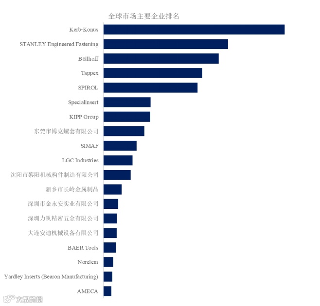 根据路亿市场策略(LP Information)头部企业研究中心调研,全球范围内自攻衬套生产商主要包括Kerb-Konus、STANLEY Engineered Fastening、Böllhoff、Tappex、SPIROL、Specialinsert、KIPP Group、东莞市博克螺套有限公司、SIMAF、LGC Industries等。2024年,全球前五大厂商占有大约53.0%的市场份额。
