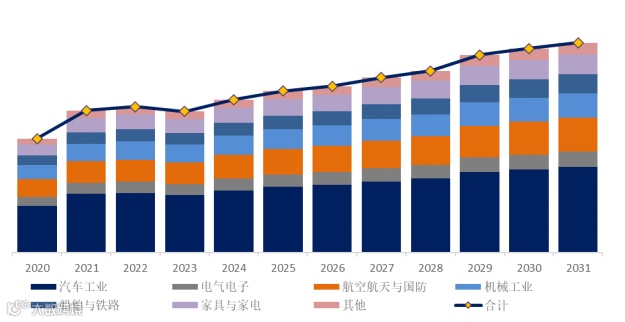 就产品应用而言,目前汽车工业是最主要的需求来源,占据大约40.6%的份额。