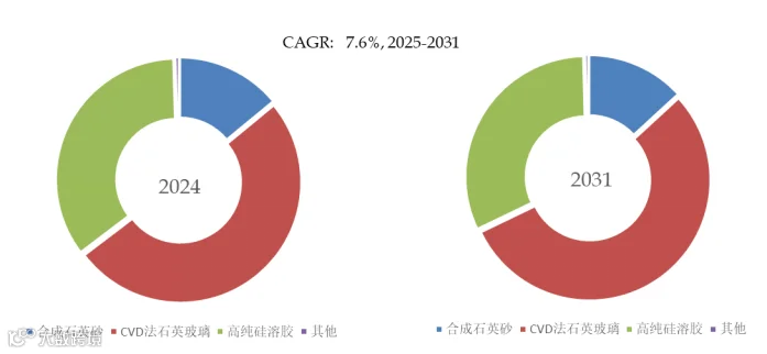 就产品类型而言,目前CVD法石英玻璃是最主要的细分产品,占据大约50.6%的份额。