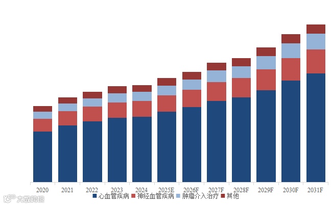 1:人口老龄化加速与心血管、外周血管等疾病发病率攀升,使 DSA 成为介入手术刚性需求。其应用已从心血管科拓展至神经外科、肿瘤科等领域,其中神经介入手术量增长最快,各类介入手术量同步上升,直接扩大了 DSA 设备的临床需求。