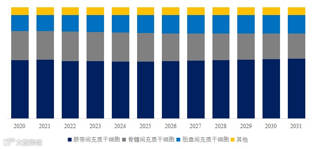 就产品类型而言,目前脐带间充质干细胞是最主要的细分产品,占据大约51.5%的份额。