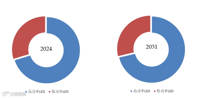 就产品类型而言,目前高功率LED是最主要的细分产品,占据70.25%的份额。