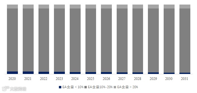 就产品类型而言,目前EA含量10%-20%是最主要的细分产品,占据大约91.25%的份额。
