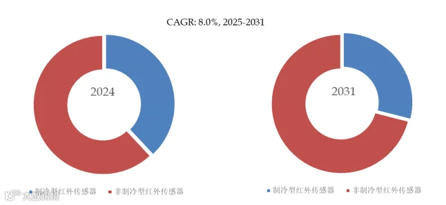 就产品类型而言,目前制冷型红外传感器是最主要的细分产品,占据大约38.0%的份额。