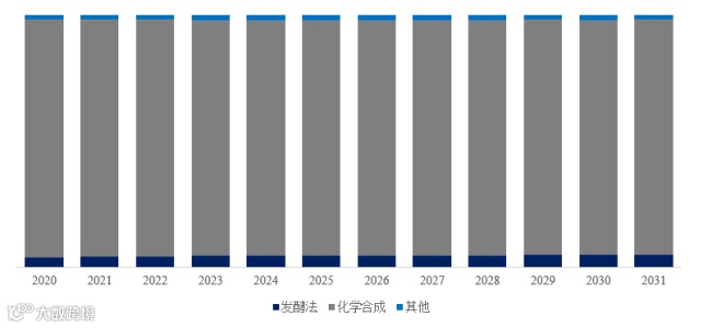 就产品类型而言,目前化学合成法是最主要的细分产品,占据大约93.5%的份额。