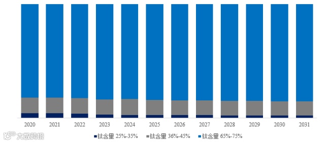就产品类型而言,目前钛含量65%-75%是最主要的细分产品,占据大约83.3%的份额。