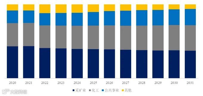 就产品应用而言,目前采矿业是最主要的需求来源,占据大约31.1%的份额。