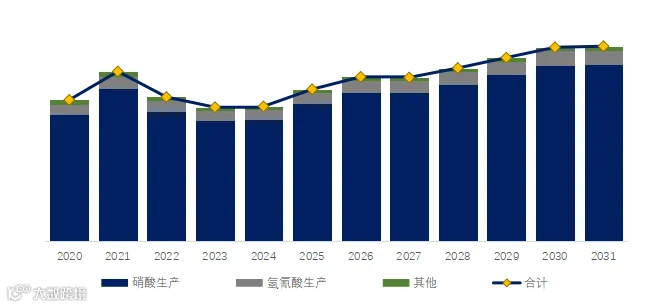 就产品应用而言,目前硝酸生产是最主要的需求来源,占据大约90.4%的份额。
