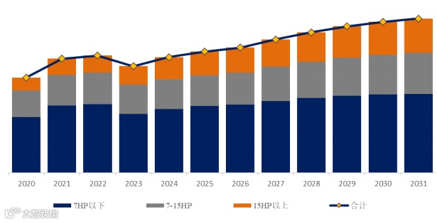 就产品类型而言,目前7HP以下是最主要的细分产品,占据大约55.3%的份额。