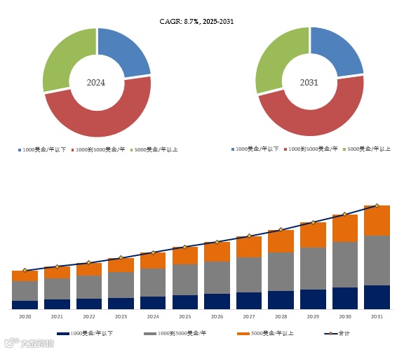 就产品类型而言,目前1000到5000美金/年产品是最主要的细分产品,占据大约46.6%的份额。