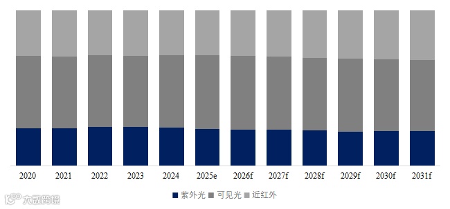 图. 透射光栅,北美市场规模,按产品类型细分,可见光处于主导地位