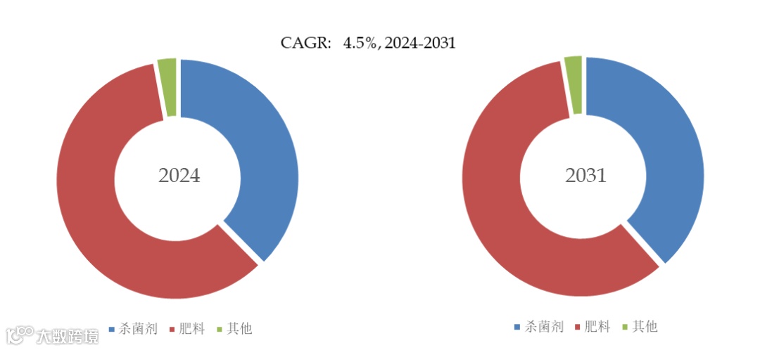 图. 亚磷酸钾,全球市场规模,按应用细分,肥料是最大的下游市场,占有59.6%份额。