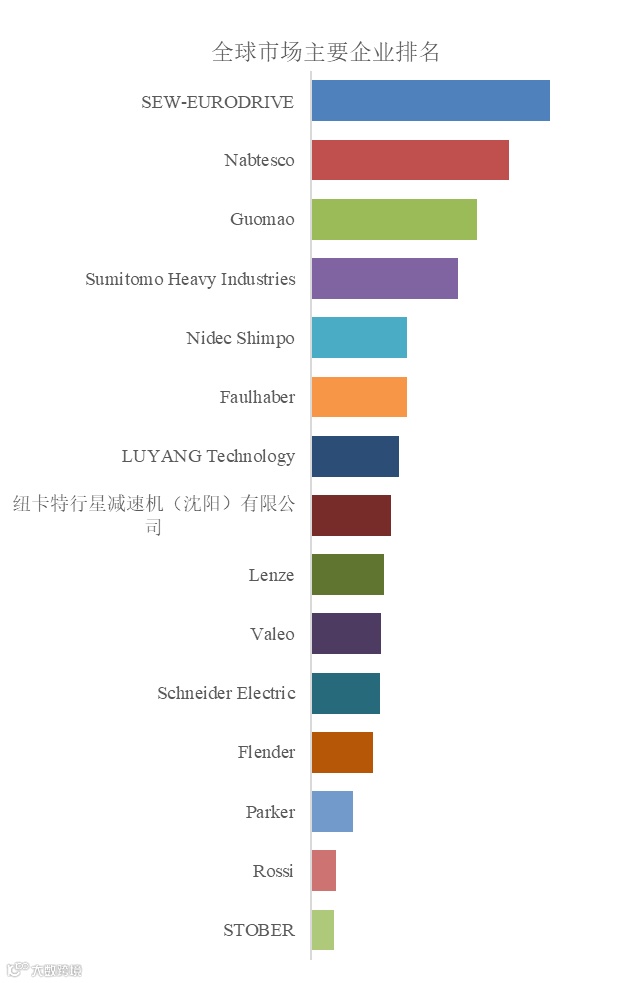 全球范围内,齿轮减速箱主要生产商包括SEW‑EURODRIVE,Nabtesco,Guomao,Sumitomo Heavy Industries,Nidec Shimpo等,其中前五大厂商占有大约38.62%的市场份额。