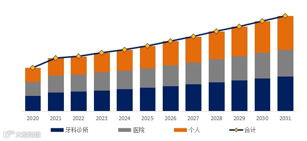 就产品应用而言,目前牙科诊所是最主要的需求来源,占据大约33.9%的份额,牙科诊所仍是主要驱动力,占据市场最大份额,随着中产阶级扩大和美学牙科普及,推动高值耗材和数字设备快速渗透;医院则以口腔专科或综合医院口腔科为代表,采购趋于规范化和高端化,尤其注重影像、种植等设备的性能与认证;而个人使用领域则受益于健康意识提升、电商普及与消费升级,智能电动牙刷、水牙线、美白护理产品等呈现爆发式增长。未来,三大应用场景将共同推动牙科市场迈向更加精准、数字化与预防为主的方向。