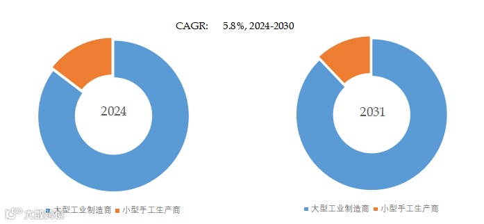 图. 巧克力制造机,全球市场规模,按应用细分,大型工业制造商是最大的下游市场,占有85.3%份额。