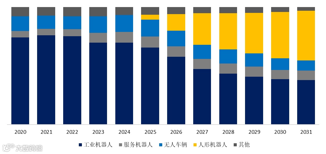 就产品类型而言,目前工业机器人是最主要的需求来源,占据大约70%的份额。