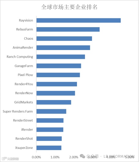 全球范围内,渲染农场主要生产商包括Ranch Computing,AnimaRender,Chaos,RebusFarm,Rayvision等,其中前五大厂商占有大约16.4%的市场份额。